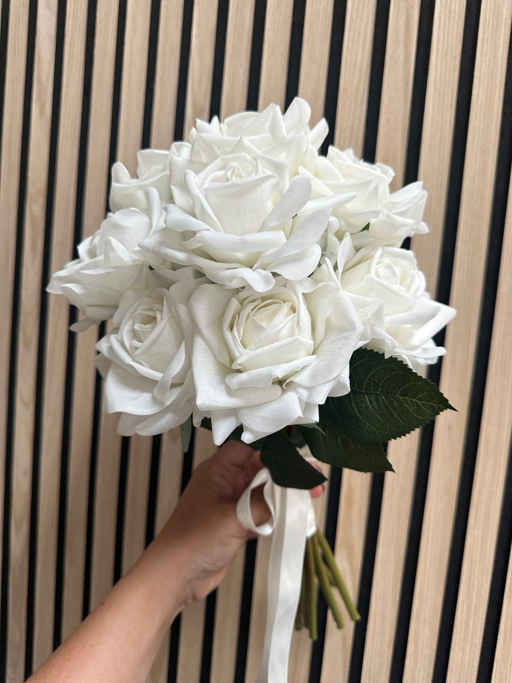 This ivory rose bridesmaid bouquet features 7 real touch roses and long stems. Experience the beauty of real flowers with the convenience and durability of artificial blooms. Perfectly crafted for your special day.