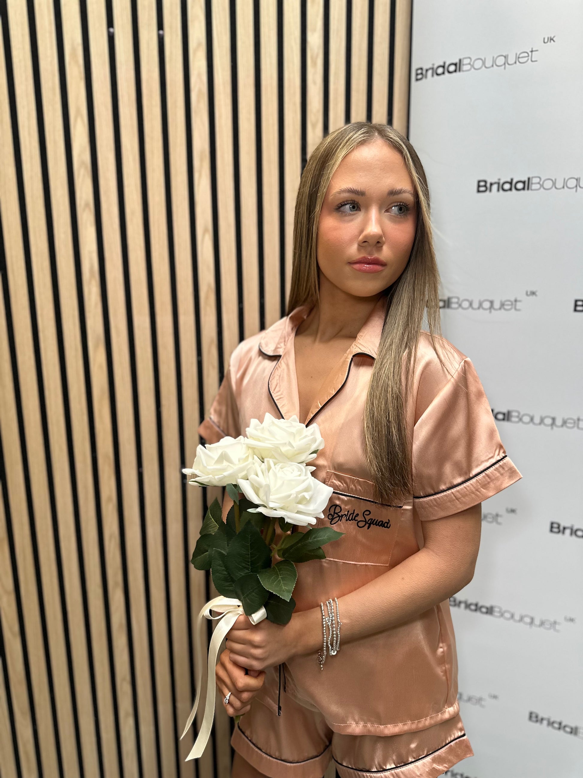 Impress your bridesmaid party with the elegant White Rose Bridesmaid Trio. This set features a beautiful rose bouquet and three individual roses to adorn the bridesmaids. The perfect touch of sophistication for any bridal party.